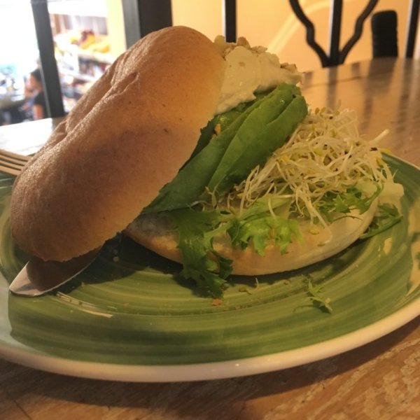 És persze meg kellett oldani a napközbeni nasit is. Szerencsére a belvárosban is találtam egy bagelezőt. Itt a rendelésnél kérdeztem meg, hogy milyen a gluténmentes bageljük. A hölgy rákérdezett, hogy allergia miatt keresek gluténmentes bagelt. Mondtam, hogy igen. Ez fontos, mivel nem minden bagel-nél tudták garantálni a keresztszennyeződés-mentességet. A hideg bagel-eket ott vették ki a zacskóból és töltötték meg minden finomsággal. Nem melegítették meg, mert a melegítő sütőben már keveredés lett volna. Nagyon korrekt magyarázatot kaptam, így nekivágtam – és szerencsém volt. A bagel nagyon jól nézett ki, finom volt és a hasam sem fájt tőle. Ugye, hogy jól néz ki?